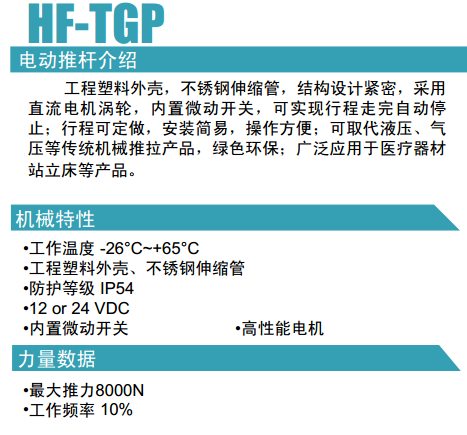 工程塑料外殼,不銹鋼伸縮管,結(jié)構(gòu)設計緊密,采用直流電機渦輪,內(nèi)置微動開關,可實現(xiàn)行程走完自動停止;行程可定做,安裝簡易,操作方便;可取代液壓、氣壓等傳統(tǒng)機械推拉產(chǎn)品,綠色環(huán)保;廣泛應用于醫(yī)療器材站立床等產(chǎn)品。