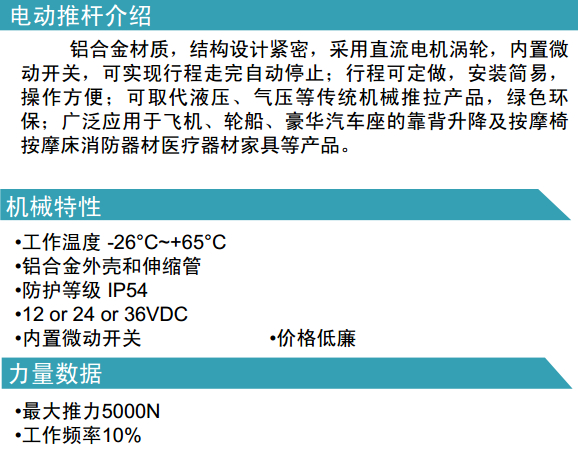 鋁合金材質(zhì),結(jié)構(gòu)設(shè)計(jì)緊密,采用直流電機(jī)渦輪,內(nèi)置微動(dòng)開(kāi)關(guān),可實(shí)現(xiàn)行程走完自動(dòng)停止;行程可定做,安裝簡(jiǎn)易,操作方便;可取代液壓、氣壓等傳統(tǒng)機(jī)械推拉產(chǎn)品,綠色環(huán)保;廣泛應(yīng)用于飛機(jī)、輪船、豪華汽車(chē)座的靠背升降及按摩椅按摩床消防器材醫(yī)療器材家具等產(chǎn)品。